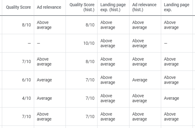 Our landing pages’ loading speed will also affect quality scores. Making sure our keywords are correctly set up (as mentioned in this article) will also improve quality scores. And lastly, our ad copy will further impact quality scores.